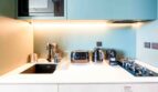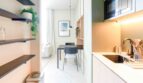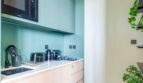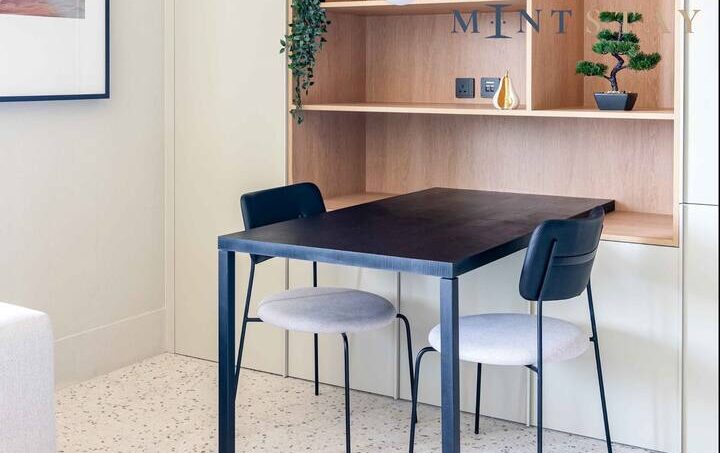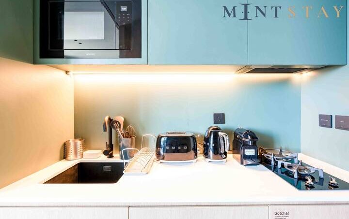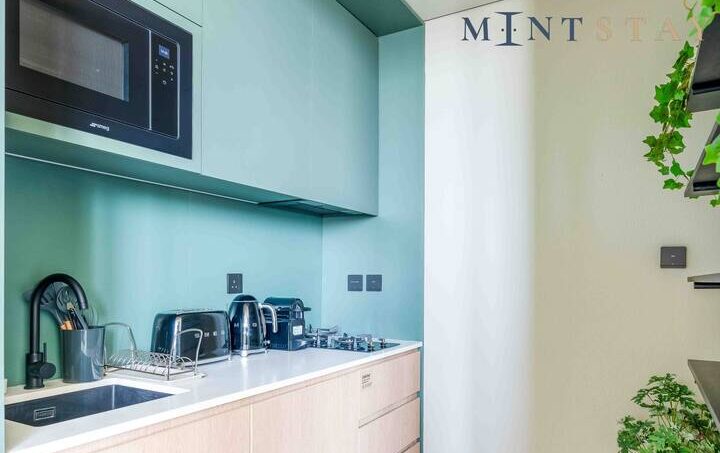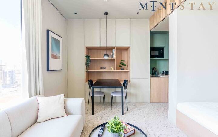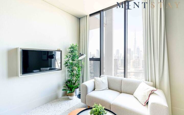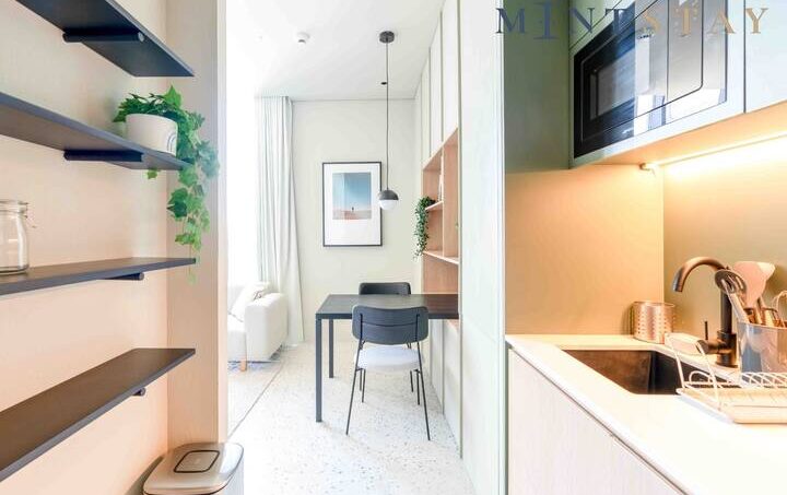 This space effortlessly blends modern convenience with a laid-back coziness. Sunlight floods through the expansive windows, offering captivating views of the Burj Khalifa and the city. There’s a palpable positivity in the air, encouraging you to embrace it all. Sink into the super comfy sofa, conveniently placed near a stylish coffee table—ideal for your books or Netflix snacks. The fully equipped kitchen, complete with a kettle, stove, microwave, toaster, and a Nespresso machine for your coffee cravings, has everything you need. The dining table provides a perfect spot for a quick meal. Let the washing machine take care of your laundry.