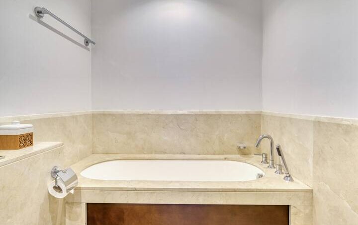 The plush king bedding of this bedroom creates a cocoon of tranquility, perfect for a good night’s sleep. The ensuite bathroom with a bathtub is the perfect place to soak away the stresses of the day, and the built-in wardrobes provide ample storage space for all of your belongings.