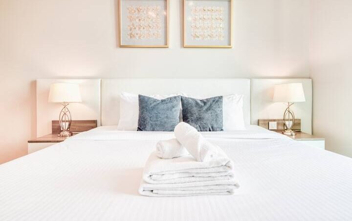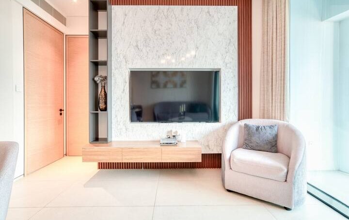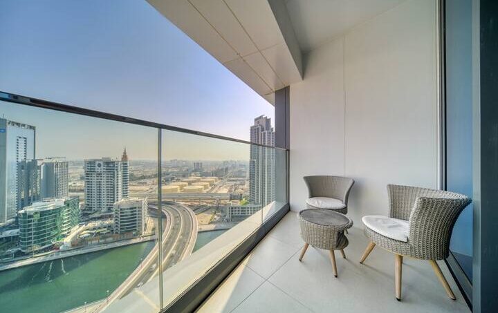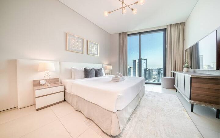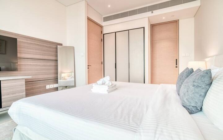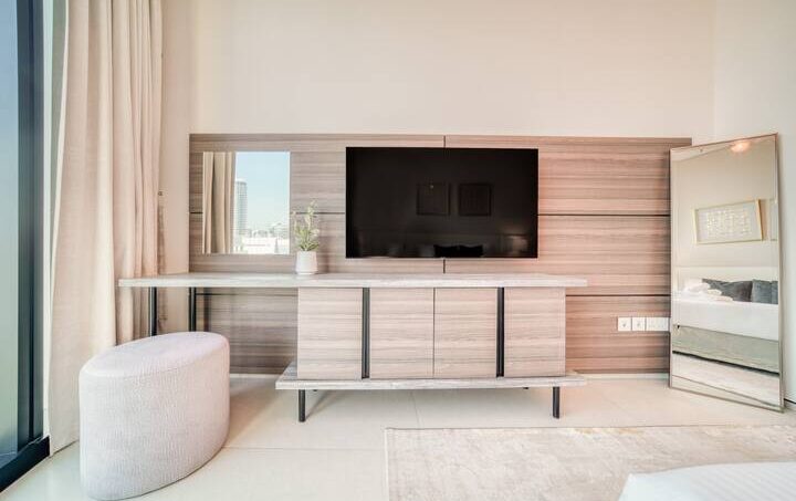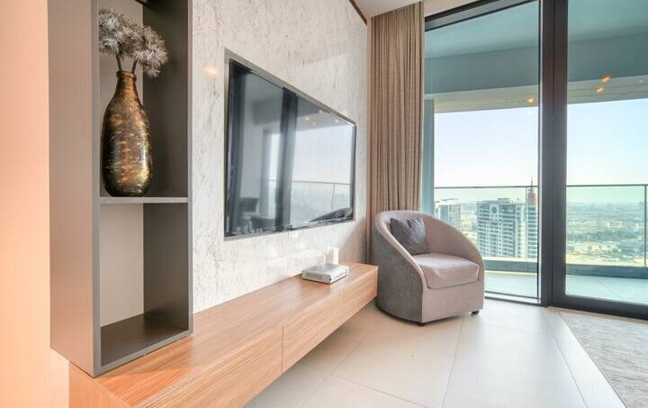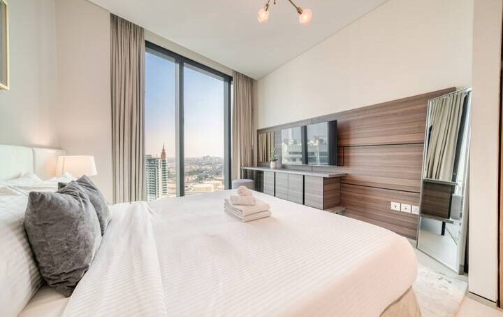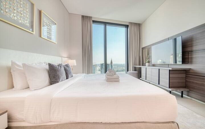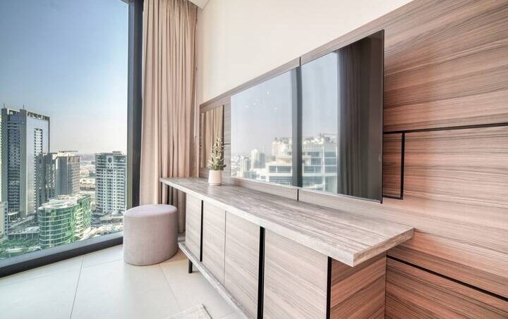 Your Dubai adventure would be incomplete without experiencing the mesmerizing skyscrapers, especially when they light up the night sky. And you get a front-row seat to this spectacle thanks to the large windows in this bedroom. Imagine relaxing on the plush king-sized bed, adorned with premium linens and pillows, while taking in the breathtaking canal and views. If you’re in the mood for a movie night, there’s a TV at your disposal. Plus, you’ll find a roomy wardrobe to keep your belongings organized.