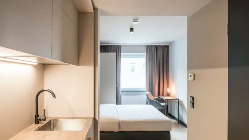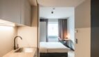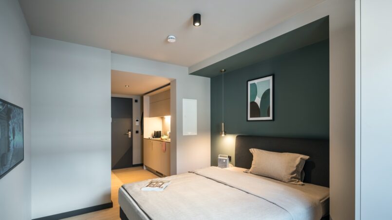 The ipartment Xtra Smart offers everything you need for a stylish and comfortable stay. It has a fully equipped design kitchenette with fridge, ceramic hob, microwave and dishwasher, a small work space with an armchair, a modern bathroom, high-quality oak wood flooring as well as all the obligatory basic ipartment- equipment. You can stretch out on the 1.40 m wide bed alone, but there’s also space for a second person.