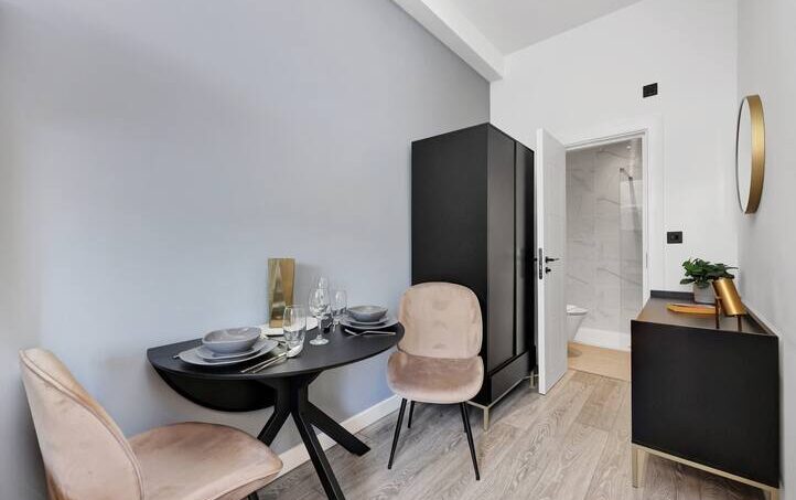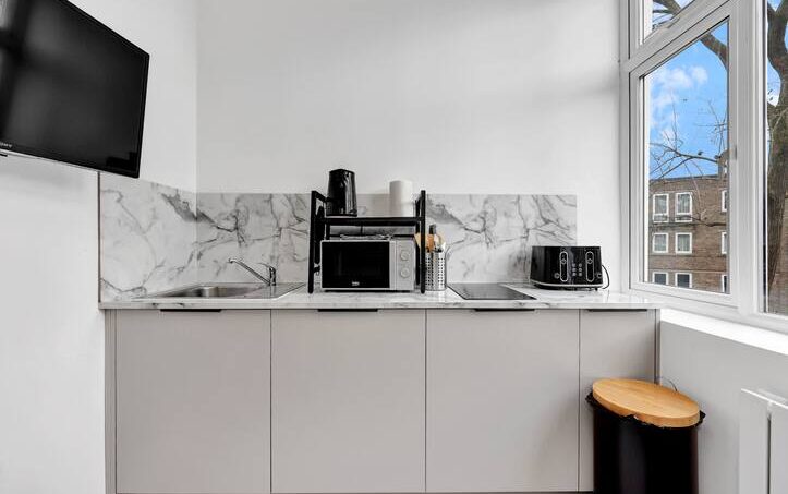 This single person studio apartment has been recently refurbished and is a great space to spend your time during your stay in London! The apartment is self-contained and has everything required for your stay, including high spec en-suite bathroom and kitchenette, living area with sofa and Smart HDTV, as well as adequate storage.