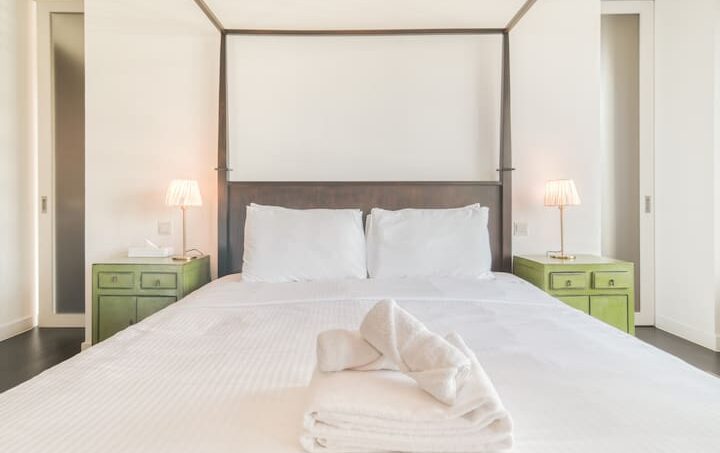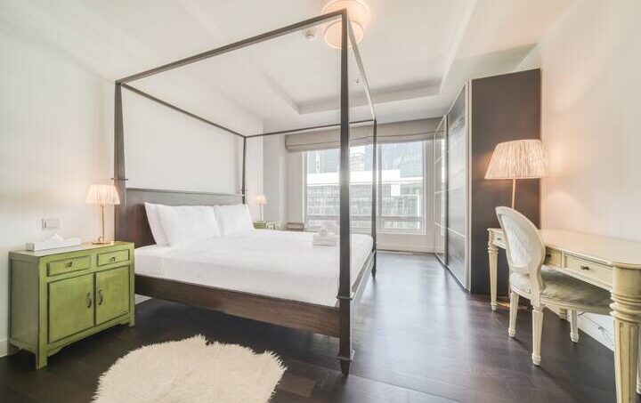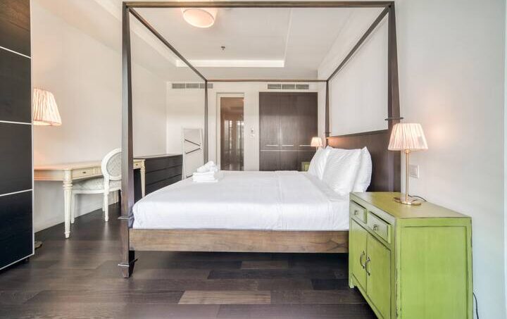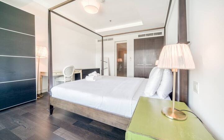This bedroom has been tastefully furnished to ensure your utmost comfort and relaxation. As you step into the harmonious bedroom, your eyes are drawn to the luxurious king-sized bed, which is centered in the space and boasts crisp, white linens. The bed’s headboard is intricately designed to create a statement of opulence and add to the timeless allure of the room.