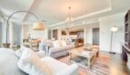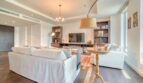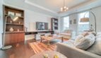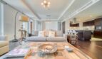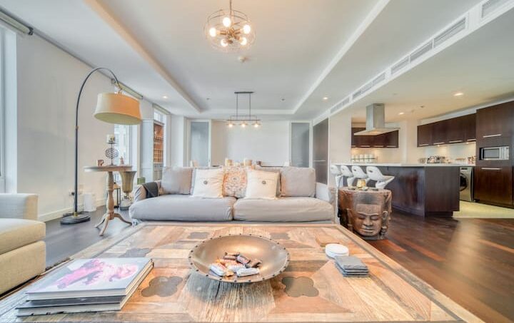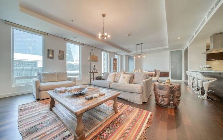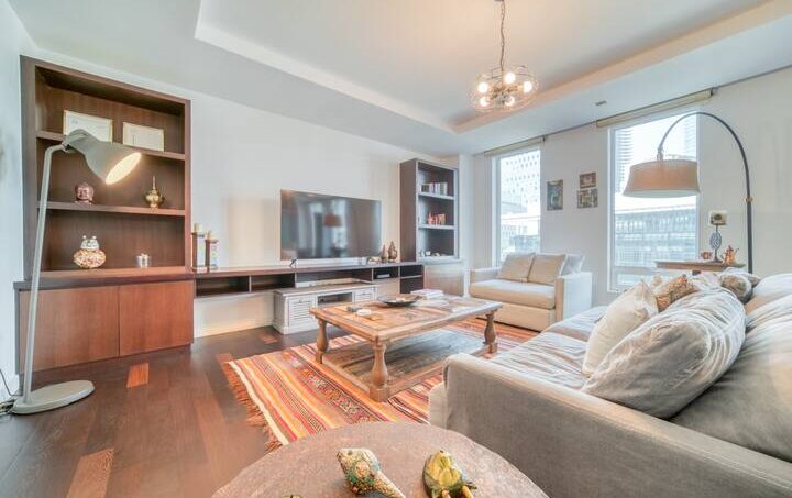 Welcome to this stunning rental living room, which boasts upscale comfort and timeless elegance. As you enter the room, you are greeted by gleaming hardwood floors that flow seamlessly throughout the space, creating a warm and inviting atmosphere. The bright and airy atmosphere is enhanced by the windows that flood the room with natural light, while also providing breathtaking views of the neighborhood. It is furnished with a coffee table, a comfortable sofa, and a flat-screen TV. The elegant floor lamps and stylish pendant light fixtures provide warm lighting, creating a cozy atmosphere. The sophisticated yet understated décor, tasteful wall art, and neutral colors and textures bring the room to life.