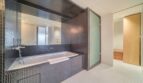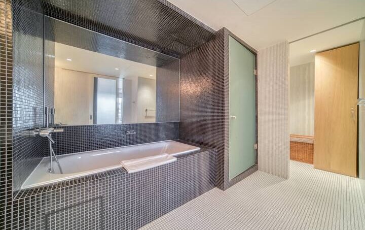 The ensuite bathroom features striking black and white checkered tiles that cover the walls, creating a modern yet timeless look. The bathroom also includes a sleek, contemporary bathtub and vanity unit, which contrast beautifully against the bold tile pattern. This is perfect for guests who want to feel pampered during their stay.