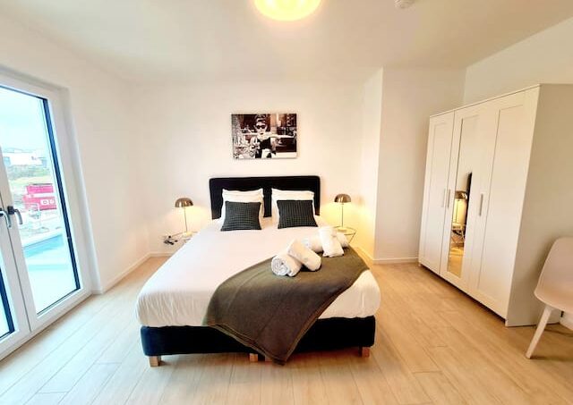 The three bedrooms have each other a large double bed, a wardrobe, a bedside table and a lamp.