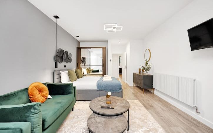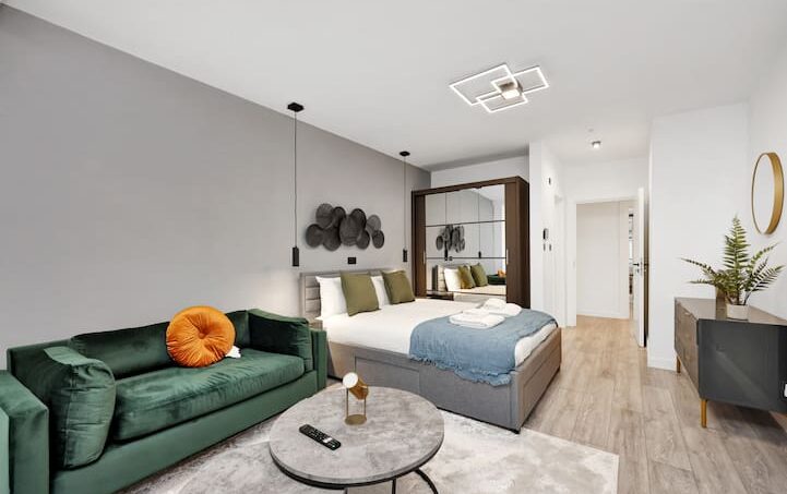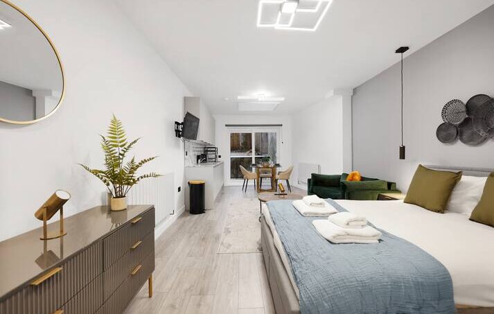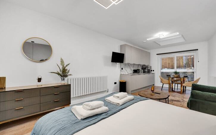 This is a high-spec spacious yet cozy lower ground floor studio apartment. Self-contained with everything required for your stay, including high spec en-suite bathroom, a sleek fully-equipped kitchenette, living area with Smart HDTV, as well as own outdoor patio area. The apartment is bright with floor to ceiling patio doors with blinds.