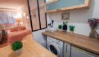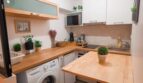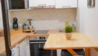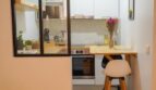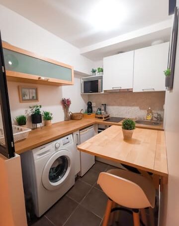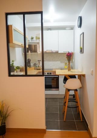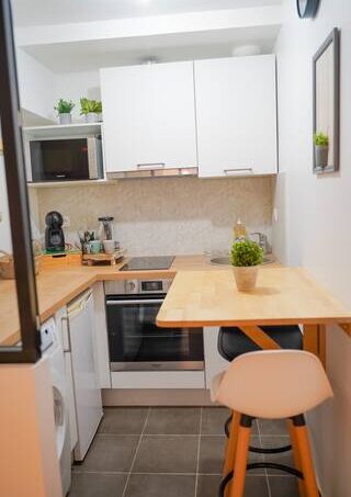 Une cuisine est à votre disposition avec une table murale et deux chaises hautes pour prendre votre petit déjeuner.