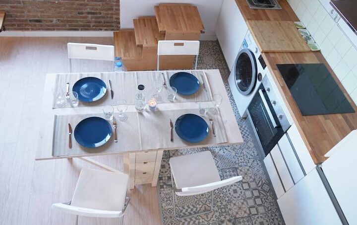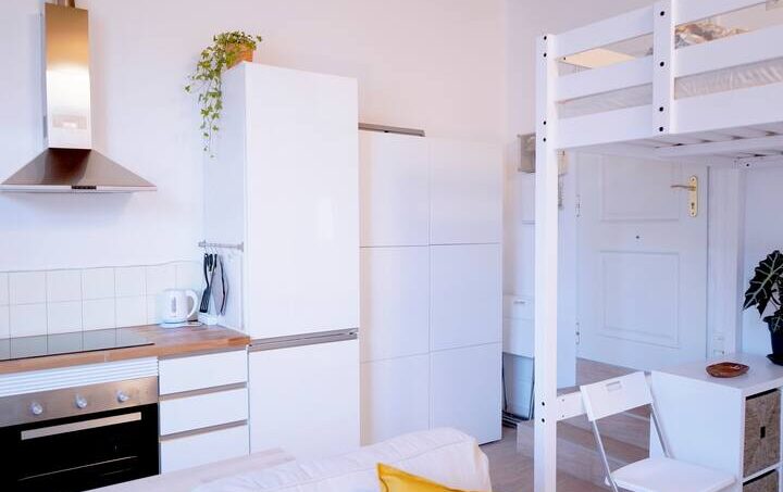 The apartment is in a vibrant neighborhood with shops, supermarkets, cafés, and restaurants nearby.