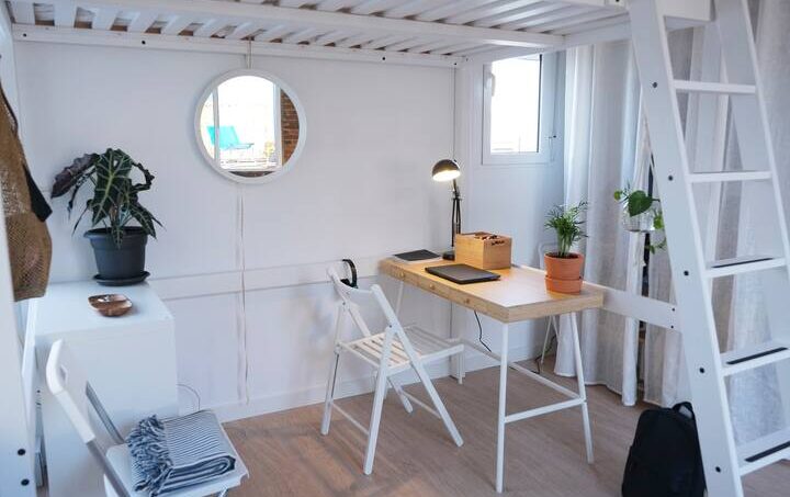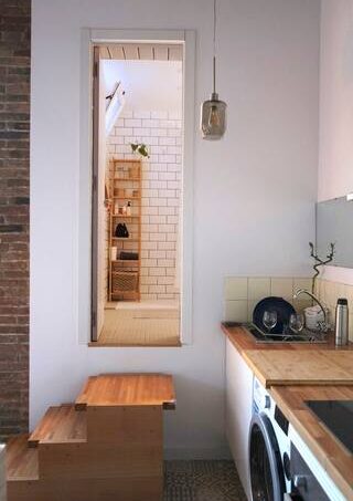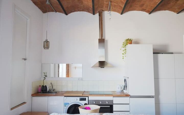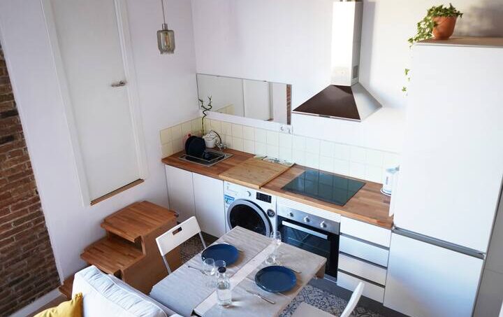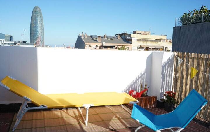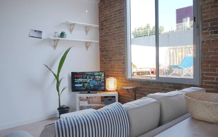 Located 15 minutes from Sagrada Familia, 5 minutes from Agbar Tower, and 10 minutes from Poblenou, this stylish space includes an open kitchen, dining area, sitting space with a smart TV, a raised double bed, a desk, and a bathroom.