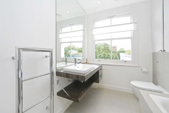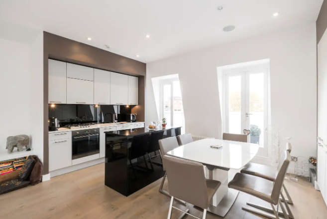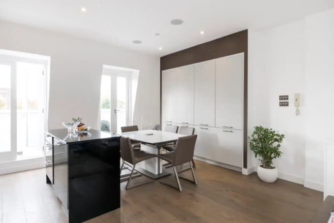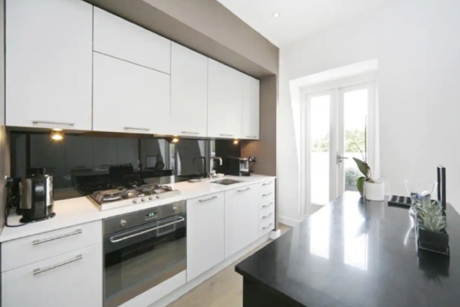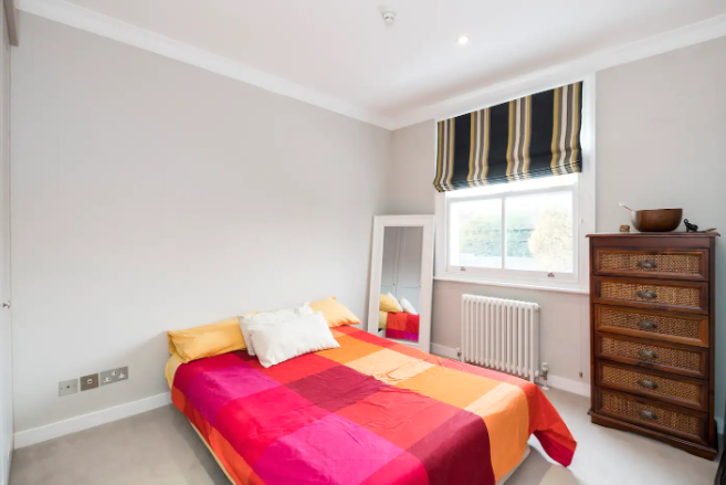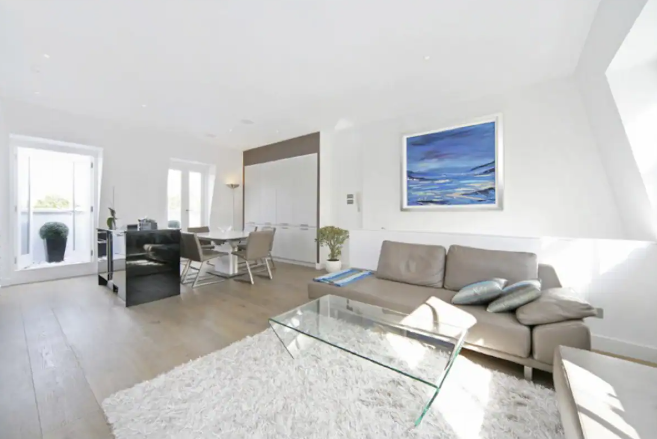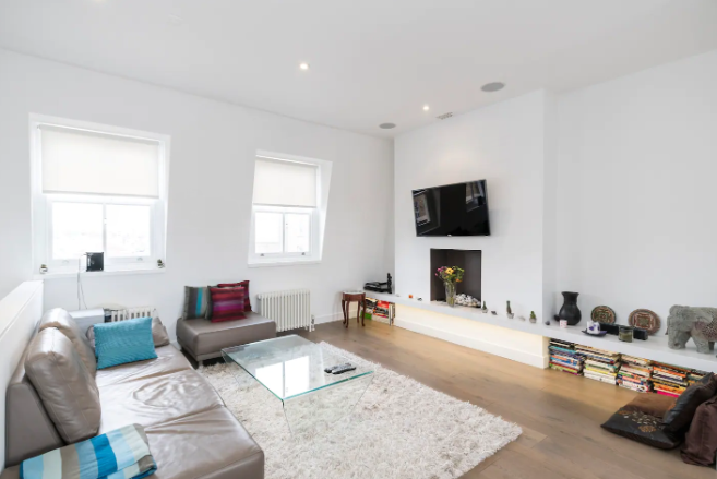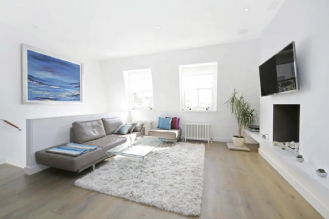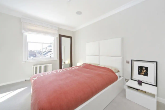 The flat is on 2 floors (second and third), the living room has a fully equipped open plan kitchen and a small balcony. The flat benefits from windows on both sides (east and west facing) and you could often catch the sunset from the living room/balcony. The master bedroom overlooks a beautiful mews, so very quiet and peaceful. Large screen smart TV, Wifi and Sky Entertainment available.