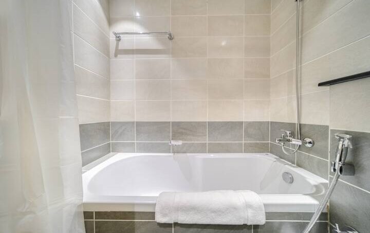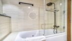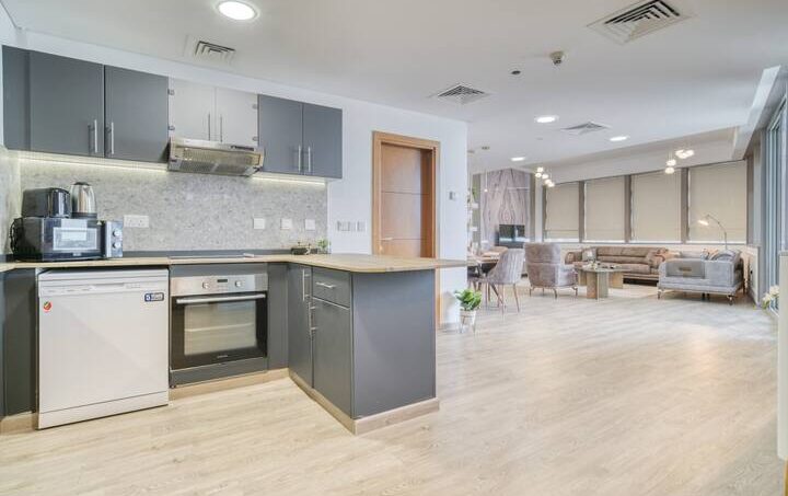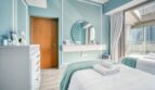 Perfectly suited to travelling friends & families alike, the open planned living space features expansive chic sofas, a coffee table, Tv and access to the apartment’s main furnished balcony, offering stunning views of the Marina from both inside the apartment and out. There is a dedicated dining area with a table to seat six, set aside from the kitchen’s service hatch. The kitchen comes equipped with all the necessary appliances for a seamless stay.