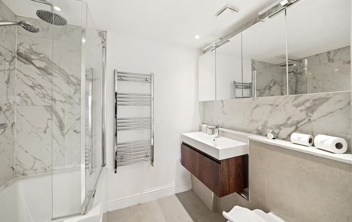 The spacious apartment is furnished to a high standard throughout, and the kitchen and bathrooms are both well equipped and finished to a high specifications. Both bathrooms have showers and baths, with one being a shared bathroom and the other an en-suite.