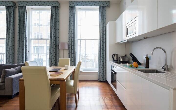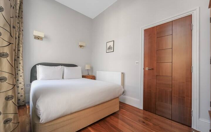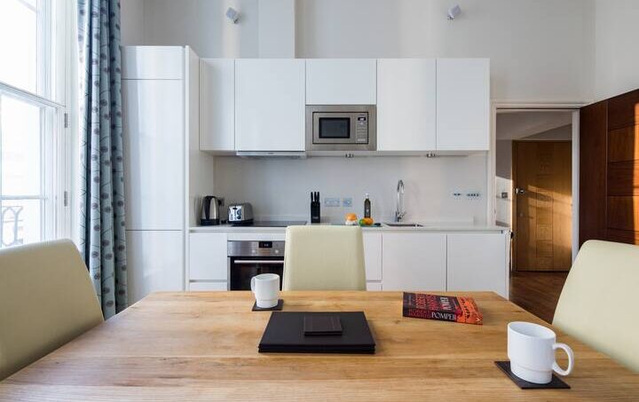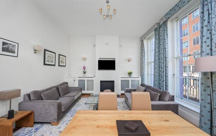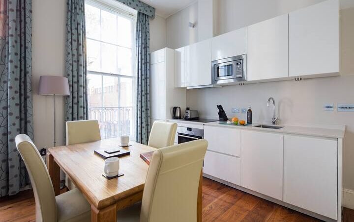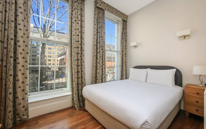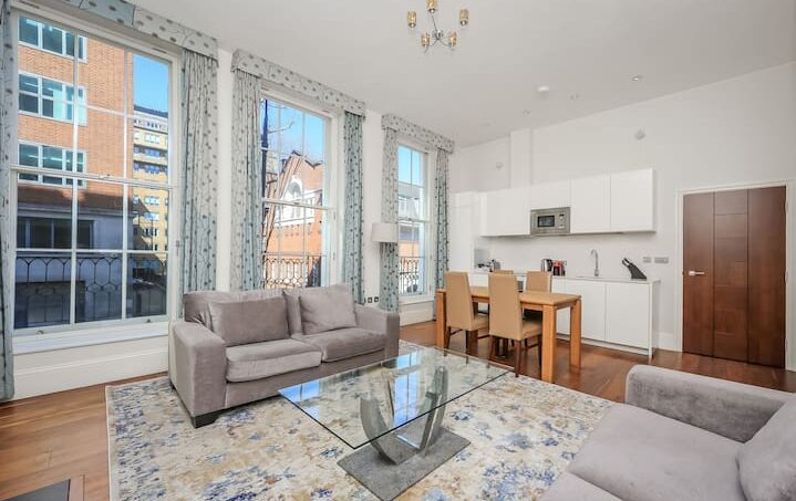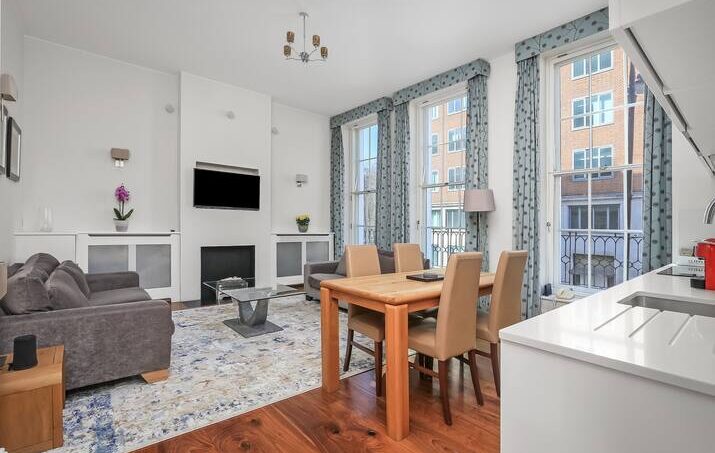 Set behind a majestic Georgian facade in a Grade II listed building, this one-bedroom apartment features high ceilings, a designer kitchen, its own private lift entrance and two balconies. The apartment is extensively soundproofed, with triple glazing to each window, and a high speed (600 mbps) WiFi connection is provided free of charge.