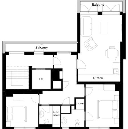 On the top floor of a Grade II listed building, this two bedroom/2 bathroom 72m2 apartment is stylish and comfortable. The living room features a pair of French windows that lead onto an attractive balcony, combined with a fully-equipped open-plan kitchen and a separate dining area. A high speed wifi connection (300 mbps) optimises home working, while a large smart TV and Bluetooth speakers, and together with separate TVs in each bedroom, provide the entertainment.