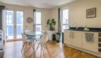 The living room is equipped with a sofa and a SMART Tv. The dining table can seat up to 4 people. The open plan kitchen is fully fitted with modern appliances.