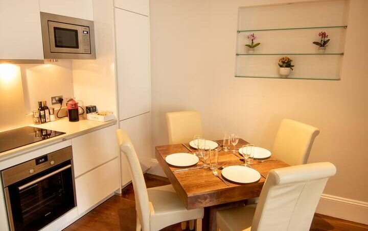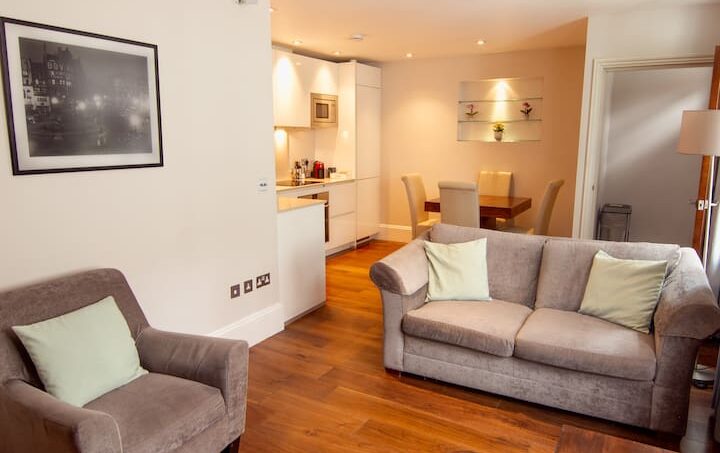 The apartment features a private entrance, a private patio and a high speed (full fibre) broadband connection. The bedroom contains a super king size bed (fitted with a premium mattress) that can be converted into twin beds. A sofa bed is provided in the living room.