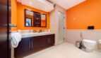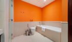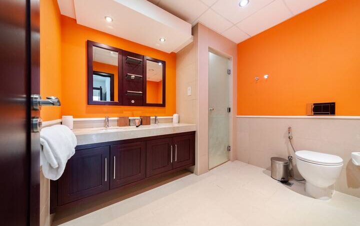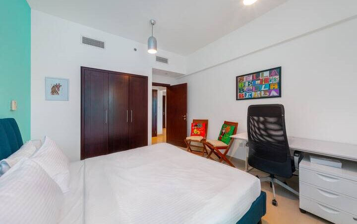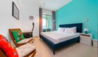 This heartwarming bedroom features a king-sized bed with two bedside tables and lampshades. You’ll have access to a wardrobe. There’s also a working space with a desk and a chair to finish your work comfortably from home.