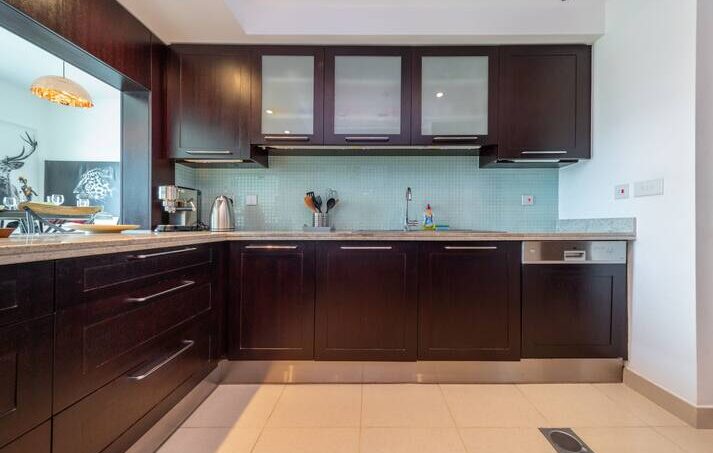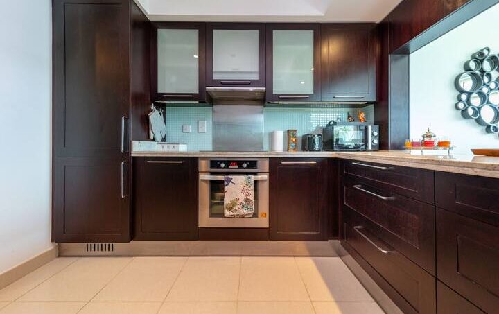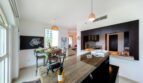 The dining area features a dining table and high chairs to accommodate 4 persons where you can devour all of your home-cooked meals, next to the contemporary style bar with high chairs. A spacious semi-open kitchen where you can prepare your favorite meals. The kitchen is also fully equipped with essential appliances for a seamless stay.