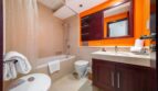 An en suite bathroom features a bathtub, a walk-in shower unit, a toilet, and a sink.