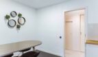 We enter the apartment through a hallway that opens to the bathroom at one end and living room at the other.