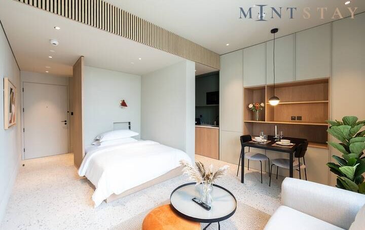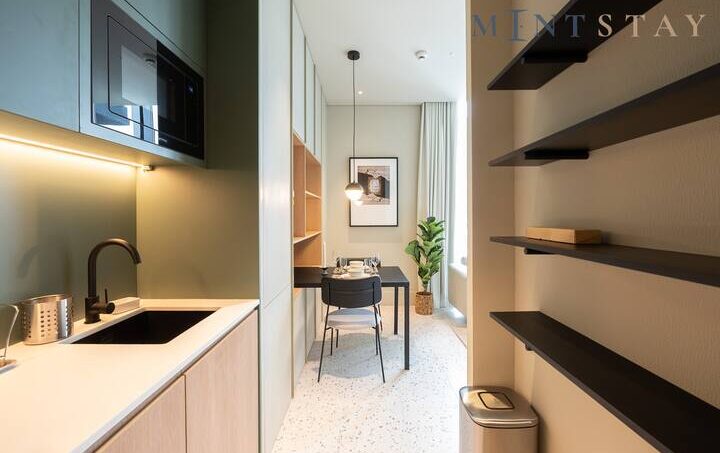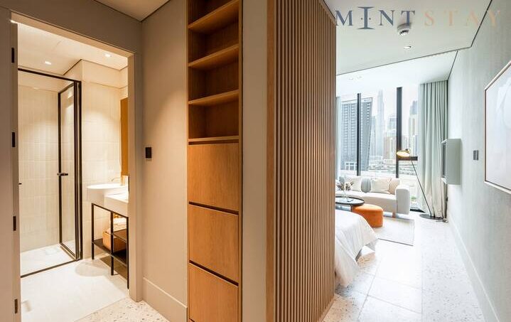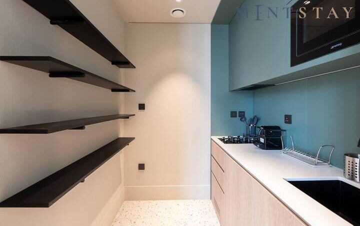 This space is a cool mix of modern functionality and comfy vibes. Loads of sunlight streaming through windows with killer views of the Burj Khalifa and the city. It’s basically sunshine and good vibes galore. You’ve got this super comfy sofa just calling your name – perfect for diving into a good book or binging on Netflix. Hungry? The kitchen’s got your back with all the essentials – kettle, stove, microwave, fridge, toaster, and of course, a Nespresso machine for the coffee addicts. Round up the gang at the dining table for a feast. Your stuff is totally safe and sound in the built-in wardrobes. No worries there!