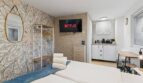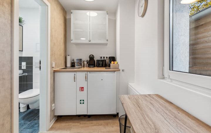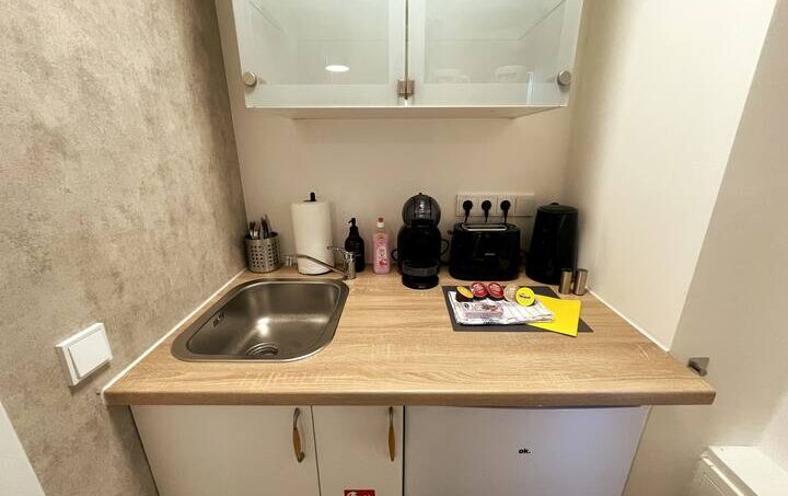 Our kitchenette is equipped with everything you need to stay with us for longer. Here you will find a Nespresso machine, a toaster, a refrigerator and a kettle. The dishes and cutlery for two people are ready to enjoy your meals in a private atmosphere. However, cooking facilities are not available.