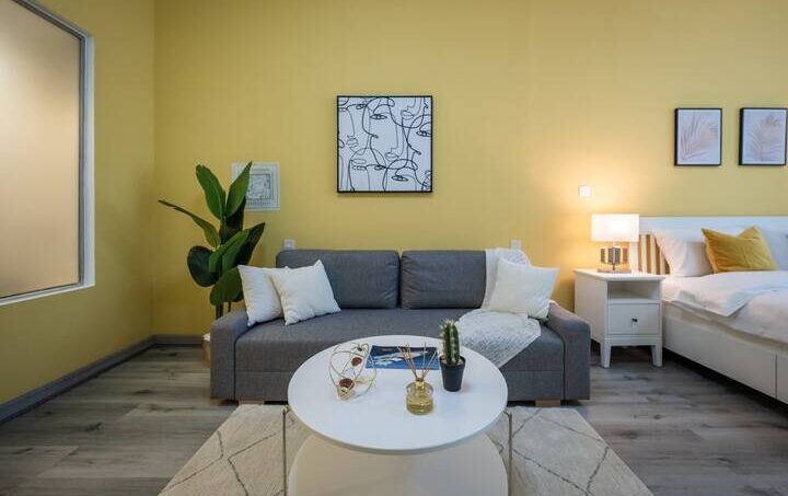 – Studio equipped with king-size bed, plush sofa, a flat-screen TV, and dining area