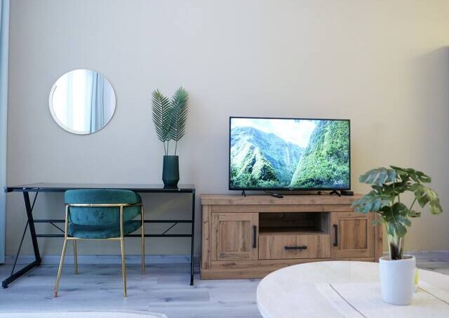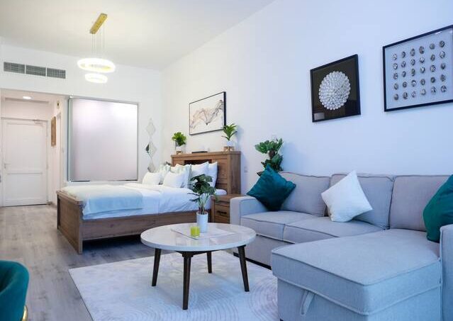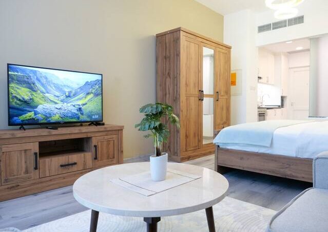 – Studio equipped with king-size bed, plush sofa, a flat-screen TV, and dining area