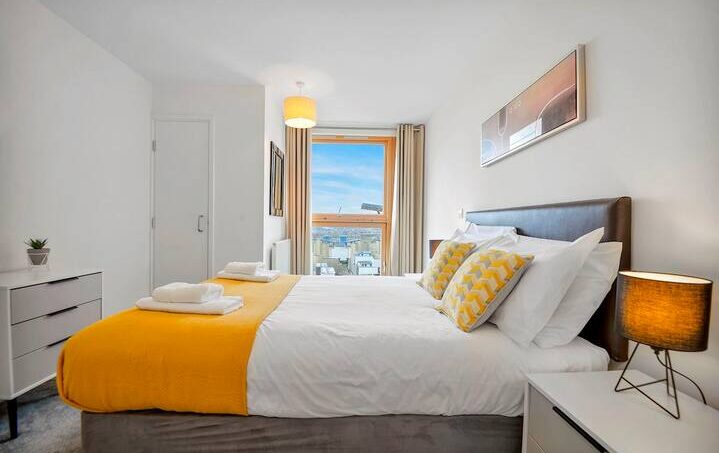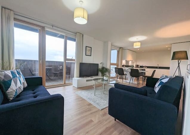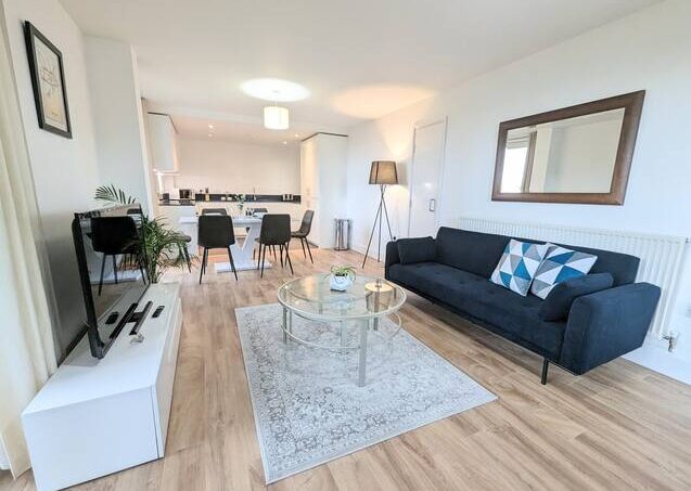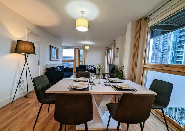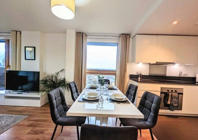 This 18th floor apartment offers great living space, spectacular views across London, is in a fantastic location close to the DLR (3 mins) and tube station (6 mins) and has everything you require for a comfortable visit to London. The apartment has a fully fitted kitchen, balcony with awesome views, and – courtesy of the double sofa bed – sleeps 6 people.