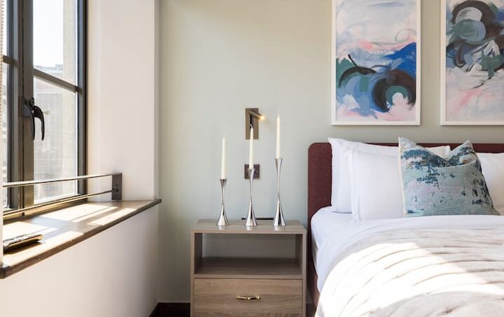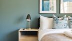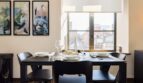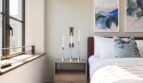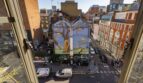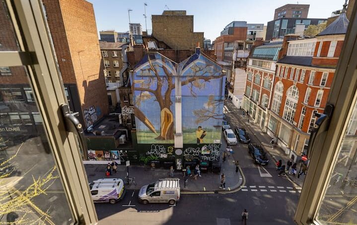The living room is bright and spacious, with large windows that overlook the bustling streets of Soho and offer a magical and unique view of the mural art “Ode to the West Wind” by Louise Vines.