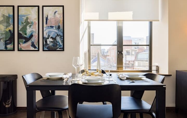 There’s also a dining table that seats four, making it easy to enjoy meals at home.