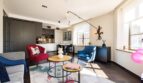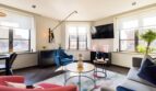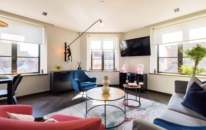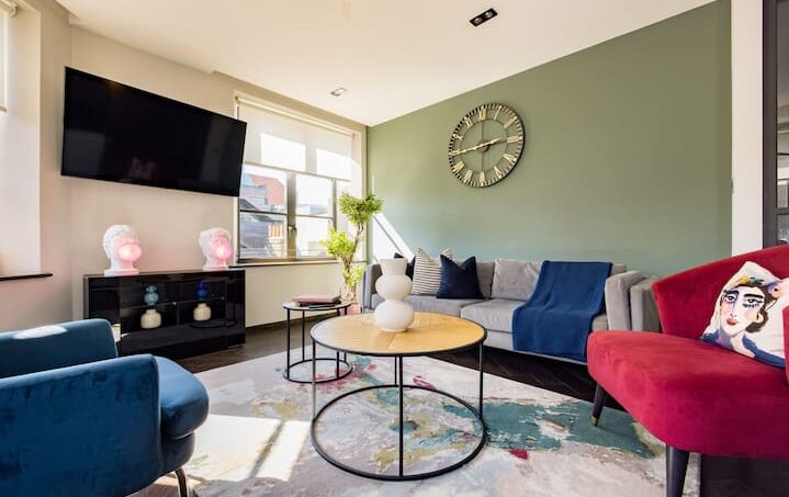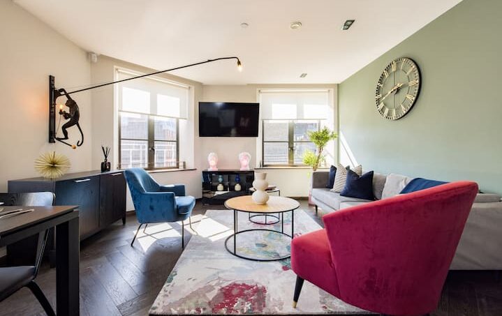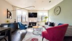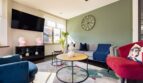 There’s a comfortable sofa and armchairs, a coffee table, and a 55″ smart TV with cable channels. The decor is chic, with pops of bright colors and contemporary artwork.