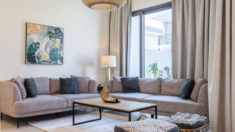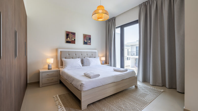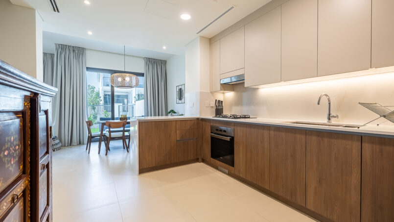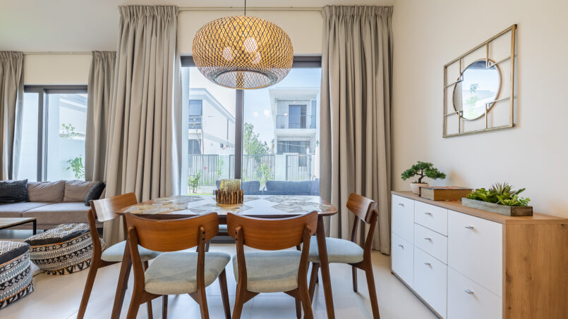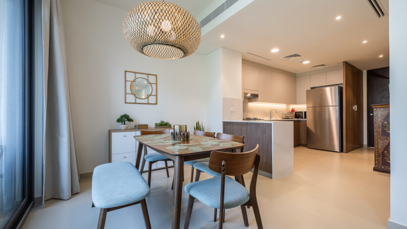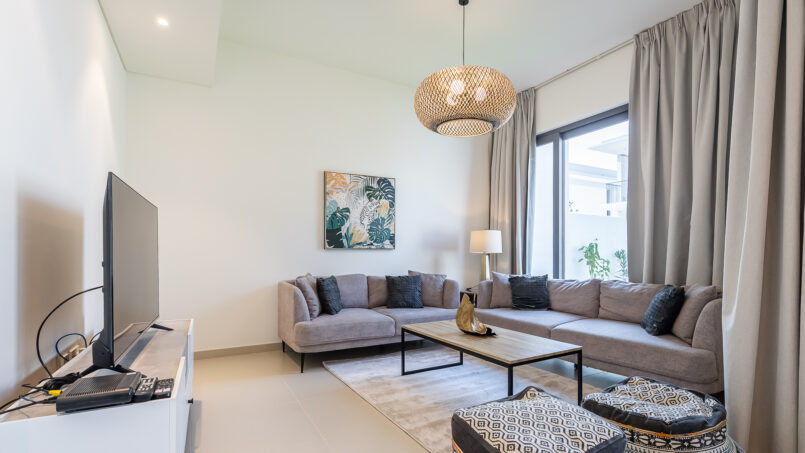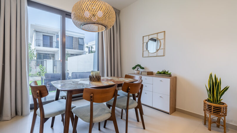Exquisite 3 bedrooms villa located in Tilal Al Ghaf. The villa has a perfect ambience with plenty of natural light emitting through the windows. Clean linens, minimal furnishings and a simple color scheme that coordinates beautifully with the great outdoors making this space welcoming. Living room is styled with a large sofa, smart Tv with the dining area. This property will amaze you with its functionality and simplicity.