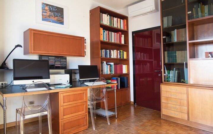 The living area, very bright thanks to the large windows exposed outside and on the terrace, consists of a living room and kitchen. In the sleeping area there is the spacious bedroom, with a double bed, and the study with a double sofa bed. The terrace is for the exclusive use of guests.