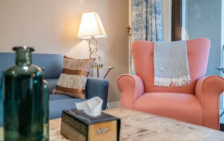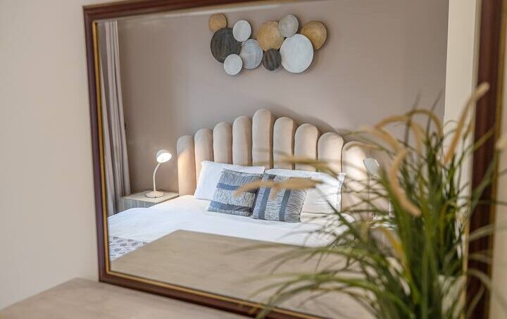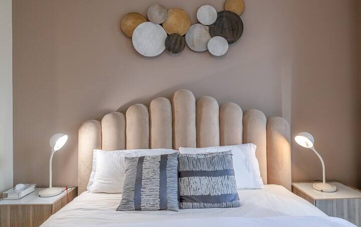The spacious bedroom is filled with earthy warm colors, set with fresh bed linen and towels. The en-suite bathroom is filled with toiletries.