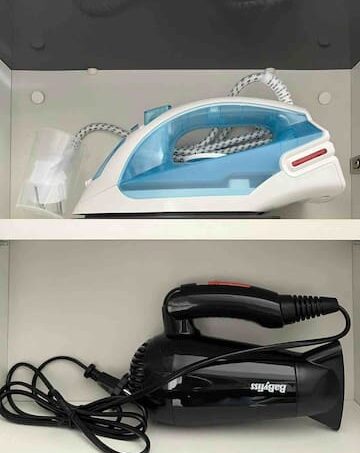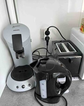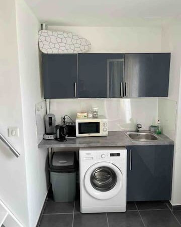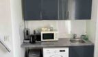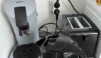 Cuisine équipée avec 4 plaques, four encastrable, machine à café, Micro-onde, grille pain et Frigo-congélateur.