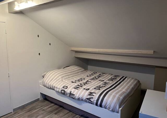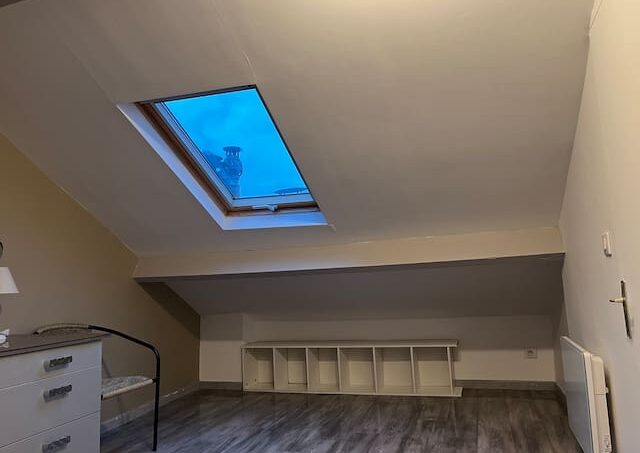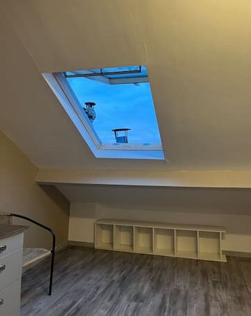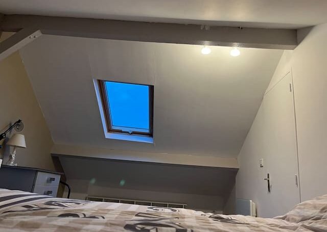Les deux chambres sont sous le toit avec chacune un store velux, et une vue sur les toits d’Arcueil.