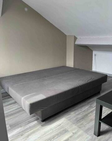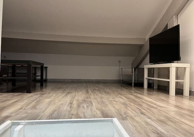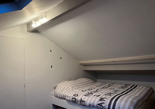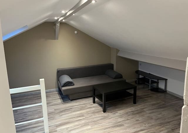 En montant les escaliers on tombe sur une chambre/salon avec un canapé clic clac (185/135), télé et petite table basse, et au fond une deuxième chambre avec un lit 2 places (140/190), de plus un matelas 2 places en dessous du lit.