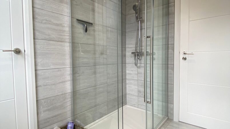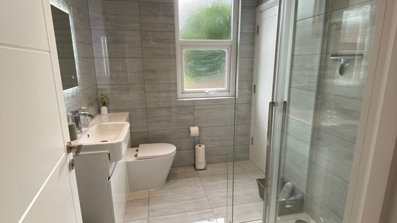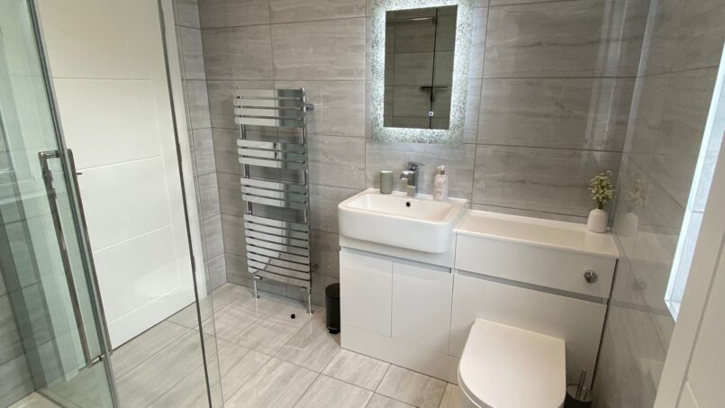 On the upper floor you will find a large double bedroom with King size bed and plenty of space to unpack your belongings and make yourself at home; there is also a spacious bathroom with a rain shower, heated towel rail, led light mirror and a small washer room with a washer dryer.