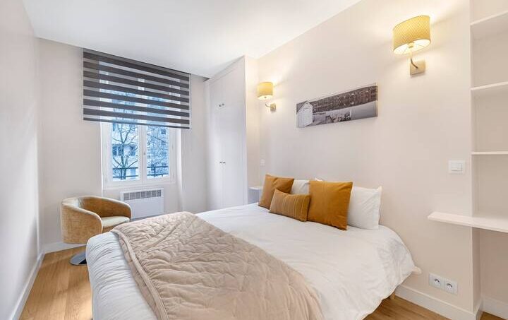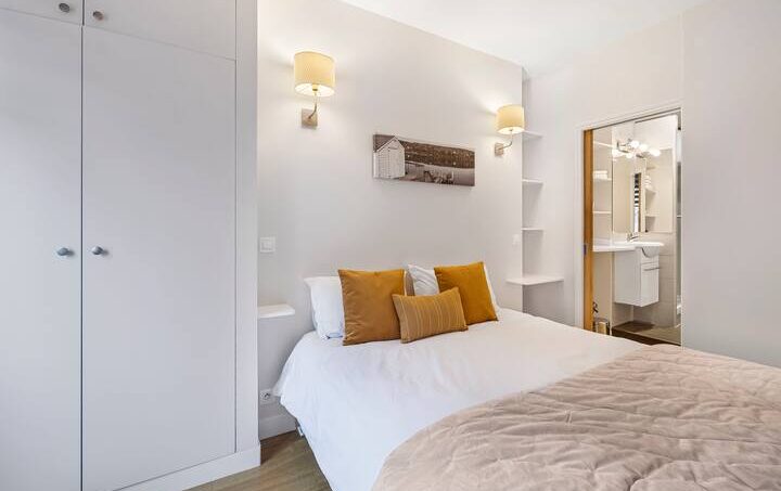 – la chambre : sur rue comprend un lit 160 cm 2 places, une penderie, et de nombreux rangements